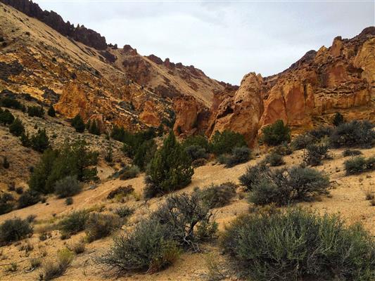 That first morning, a light rain rolled into the area … no problem for a Portlander! Ditching our original goal to backpack that night, we explored around Leslie Gulch for the remainder of the day. Big canyons, red rocks, juniper trees and scorched earth awaited us as we set off from the Juniper Gulch trailhead. This felt more like the desert country in southern Utah than anywhere in Oregon, and we happily stomped ahead as the only group on the trail.