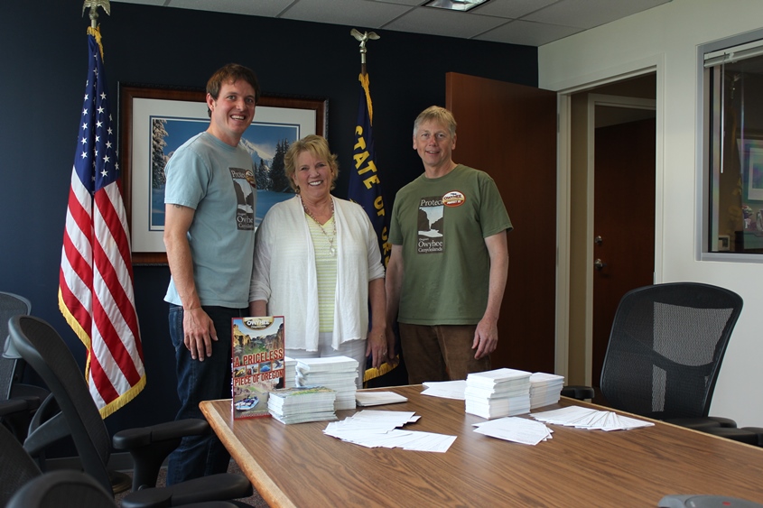 Owyhee Canyonlands support Richard Brandt, right, poses with Campaign for the Owyhee Canyonlands staff Chris Hansen, left, and a staffer for U.S. Sen. Ron Wyden at the senator’s Portland office.