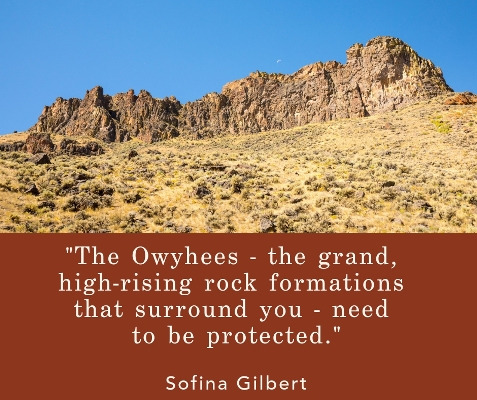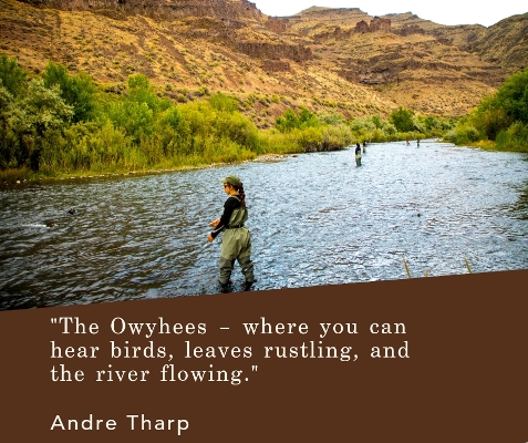 “The Owyhee – where you can hear birds, the leaves rustling in the wind, and the river flowing. Imagine looking around and seeing only the vast rock structures along with the trees surrounding you. Imagine falling asleep looking at the star-filled sky and waking up to butterflies floating over a family of wild turkey crossing the road next to you. This place is the Owyhee.”