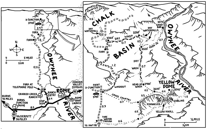 From Burns Junction, take Highway 95 left for exactly 8 miles to a gravel side road on the left marked only by a stop sign. Follow this excellent gravel road left for 3.4 miles. Along the way you’ll pass through an open ranch gate marked “No Hunting or Trespassing,” but you’re still on a public road.